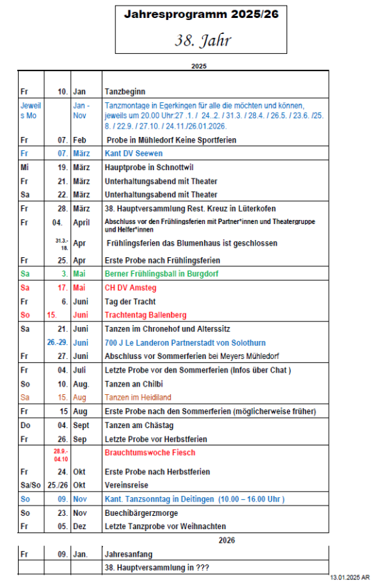 Unser Verein setzt sich ein für die Erhaltung unserer schönen Bucheggberger Trachten, für die Pflege des Volkstanzes. Wir engagieren uns für den Erhalt unseres Brauchtums, organisieren mehrere Veranstaltungen im Jahreskreis und pflegen natürlich auch die Gemeinschaft im Verein.